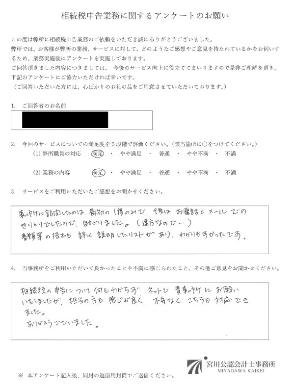 宮川公認会計士事務所では、相続税申告をご依頼いただいた方に、評判アンケートを実施して、お客様の満足のいくサービスを提供できたか、事務所として適切な対応ができたか等を定期的に確認しています。