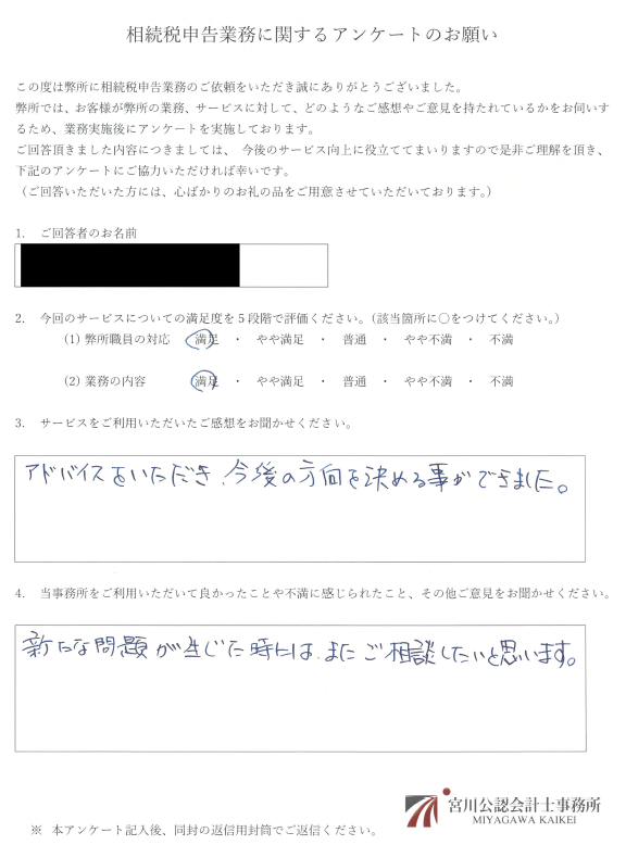 宮川公認会計士事務所では、相続税申告をご依頼いただいた方に、評判アンケートを実施して、お客様の満足のいくサービスを提供できたか、事務所として適切な対応ができたか等を定期的に確認しています。
